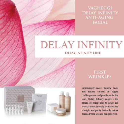 From the age of thirty it is a good idea to change certain steps in our beauty routine. The legacy of youthfulness that came with our DNA at birth starts to show early signs of waning, with the first wrinkles, and thinner skin that is less elastic and reactive to the continual contraction and relaxation of the micro muscles responsible for facial expressions. The Vagheggi R&D laboratories have created the Delay Infinity line for use during the initial stages of skin change. It is specific for skin that is starting to show early wrinkles or for those who want to take preventive action, and it leaves the skin a fresh, smooth, uniform look.